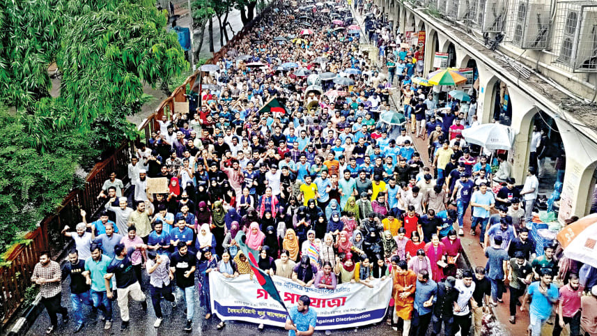 Chanting slogans against the quota system in government jobs, several hundred university students headed towards the Shahbag intersection to continue their protest around 3:45pm yesterday. The demonstration lasted an hour, causing severe traffic congestion in nearby roads. PHOTO: SIRAJUL ISLAM RUBEL