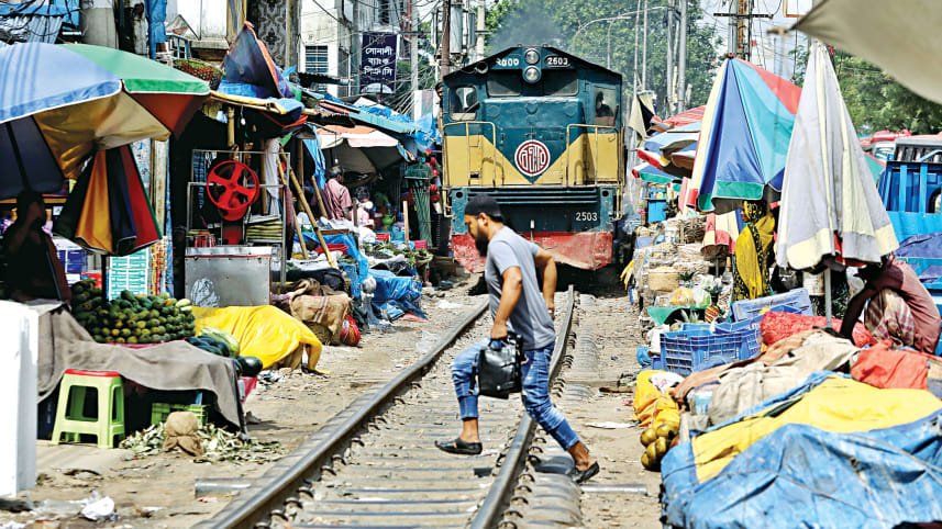 A man running across the rail track near Narayanganj’s Chamber Road, with an incoming train just a few feet away. Meanwhile, multiple makeshift shops stand dangerously close to the tracks, raising the possibilities of accidents. PHOTO: ANISUR RAHMAN