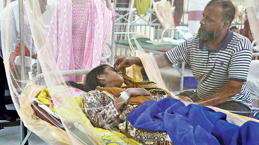 Lamia, a dengue patient from Barishal, is being cared for by her father Mujibur Rahman at the capital’s Mugda Medical College and Hospital yesterday. The first-year honours student was referred to Dhaka five days ago after her health deteriorated. Photo: Anisur Rahman