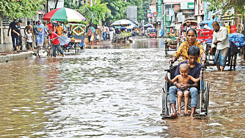 Assisted by a woman, a specially abled child in a wheelchair makes his way along the waterlogged Mugda hospital road in the capital yesterday. According to locals, this road often gets flooded after moderate rainfall due to poor drainage. Photo: Anisur Rahman