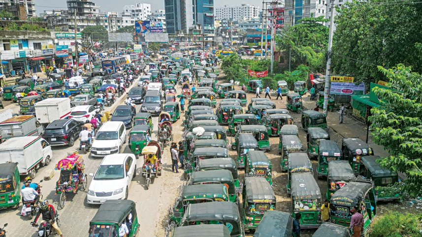 Illegally parked CNG-run autorickshaws disrupt traffic flow near Beribandh intersection in the capital’s Mohammadpur, causing congestion in the area. The photo was taken around noon yesterday. Photo: Rashed Shumon