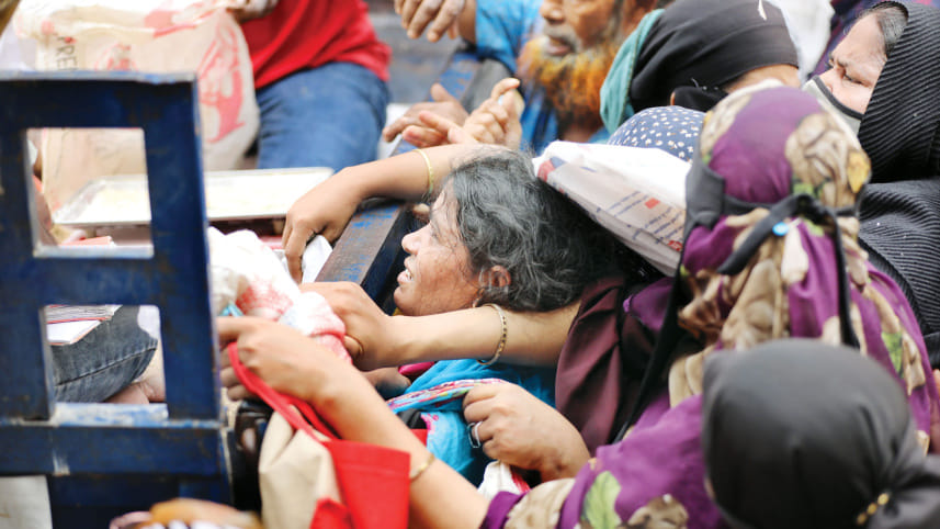 Women jostle for their space in a queue in front of an OMS truck on Ring Road in the capital’s Mohammadpur yesterday. Many of them, mostly from low-income families, waited nearly three hours to buy rice and flour at subsidised prices as the truck reached there at noon instead of the scheduled 9:00am. Photo: Prabir Das