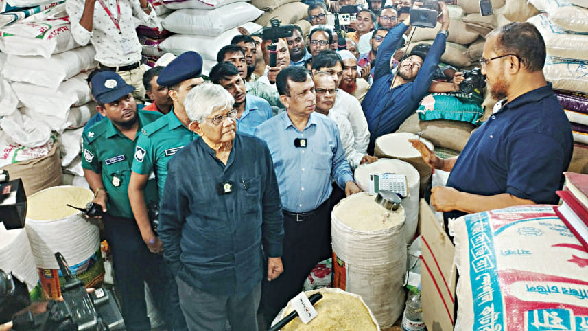 Commerce Adviser Salehuddin Ahmed visited the Karwan Bazar kitchen market in the capital to inspect the prices of essential commodities yesterday. During the visit, the adviser sought price charts of different commodities from the traders and suggested they reduce the gap in production, wholesale and retail prices. Photo: Star