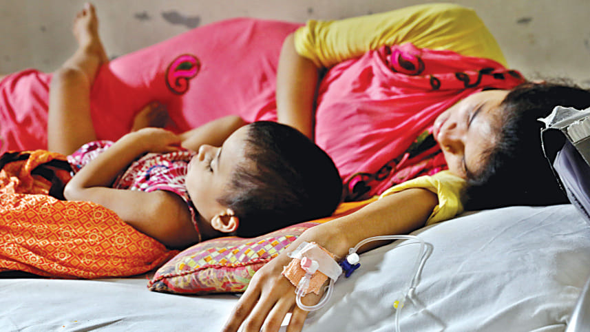 Rima, 21, has to take care of her daughter while undergoing dengue treatment as there is no one to look after her child at home. After being diagnosed with the disease, she was admitted to a DNCC hospital in the capital’s Mohakhali on Sunday. Dengue cases and fatalities have been on the rise, with at least 214 people having died this year already. Photo: Anisur Rahman