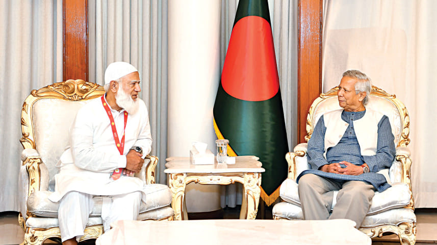 Chief Adviser Prof Muhammad Yunus holds a meeting with Jamaat-e-Islami Ameer Shafiqur Rahman at the state guest house Jamuna yesterday. Shafiqur led a Jamaat delegation to the meeting. Photo: PID