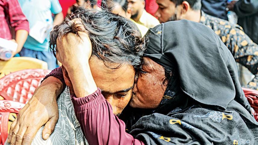 Fisherman Ferdous’s mother welcomes her son with hugs and kisses after he was handed over to his family by the Bangladesh Coast Guard at No-15 jetty of Karnaphuli channel in Patenga yesterday morning. Like Ferdous, 90 fishermen and sailors were detained by the Indian Coast Guard while fishing on December 9. They were brought back yesterday after a prison exchange programme at the Bangladesh-India Maritime Boundary Line. PHOTO: RAJIB RAIHAN