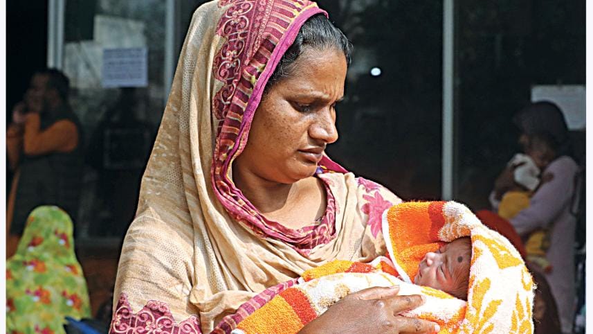 A woman sunbathing her seven-day old nephew, who was admitted to Dhaka Shishu Hospital with a cold, after having his echocardiogram done yesterday. The child, born on December 31, was admitted to a Shariatpur clinic the very next day with a cold and then referred to the hospital in the capital. According to doctors, around 40 new patients are admitted every day, 60 percent of them with cold-related issues. PHOTO: PRABIR DAS