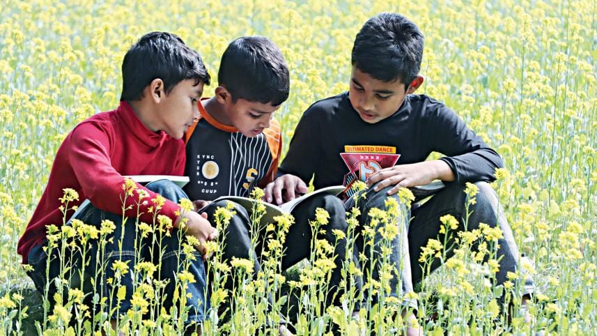 GOLDEN MOMENTS OF CHILDHOOD... On a tranquil morning, little ones bask in the gentle winter sunshine, lost in stories amid the blooming mustard fields in Babuganj upazila, Barishal yesterday. Photo: Titu Das