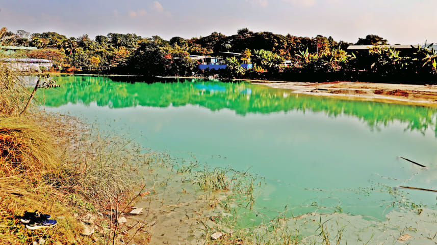 The water of this ditch near the Botanical Garden in Mirpur’s Goran Chat Bari area has turned blue due to toxic chemical waste from different factories. The photo was taken yesterday. Photo: Anisur Rahman