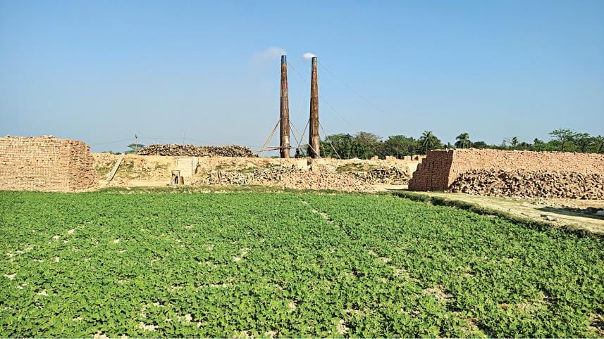 A brick kiln in Charfesson, Bhola, has been built on farmland. The owners source clay from the topsoil of neighbouring fields and burn wood to run the kiln, both harmful to the environment and illegal. Photo: Monir Uddin Anik
