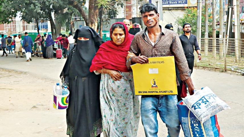 Without getting treatment, a female patient along with her attendants returning home from the Sylhet MAG Osmani Medical College Hospital yesterday. Outdoor treatment at the healthcare facility stopped as interns demonstrated to press home their five-point demand, including immediate recruitment of 10,000 doctors. Photo: Sheikh Nasir