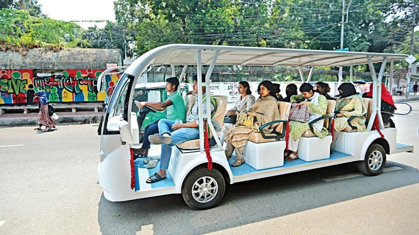 Dhaka University yesterday introduced electric shuttle cars as a means for students to get around the campus more conveniently. Under an initiative supported by the Green Future Foundation, four “Campus Shuttles” will operate daily from 8:00am to 8:00pm. Fares will be between Tk 10 and Tk 20, depending on the route. Each vehicle can accommodate around a dozen people. The photo was taken yesterday at TSC. Photo: Firoz Ahmed