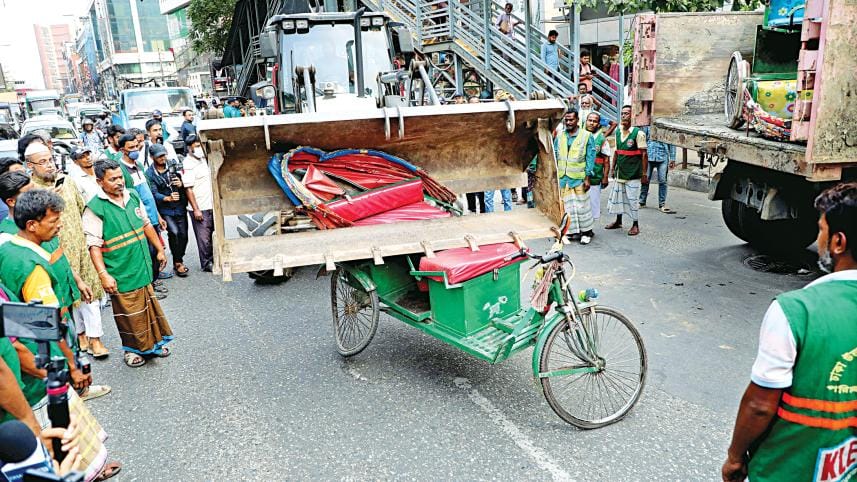 A bulldozer crushes and carries away a battery-run autorickshaw as part of Dhaka North City Corporation’s drive to remove such vehicles from major streets in an effort to reduce traffic congestion and improve road safety in the capital. More than 100 illegal auto-rickshaws were seized during yesterday’s drive between Dhanmondi-27 intersection and Asad Gate. Photo: Palash Khan