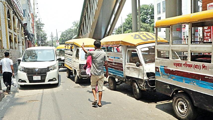 Human hauliers, locally known as legunas, are parked occupying along a stretch of Indira Road in the capital’s Farmgate area, causing inconvenience to pedestrians and disrupting vehicular movement. The photo was taken around 11:30am yesterday. Photo: Prabir Das