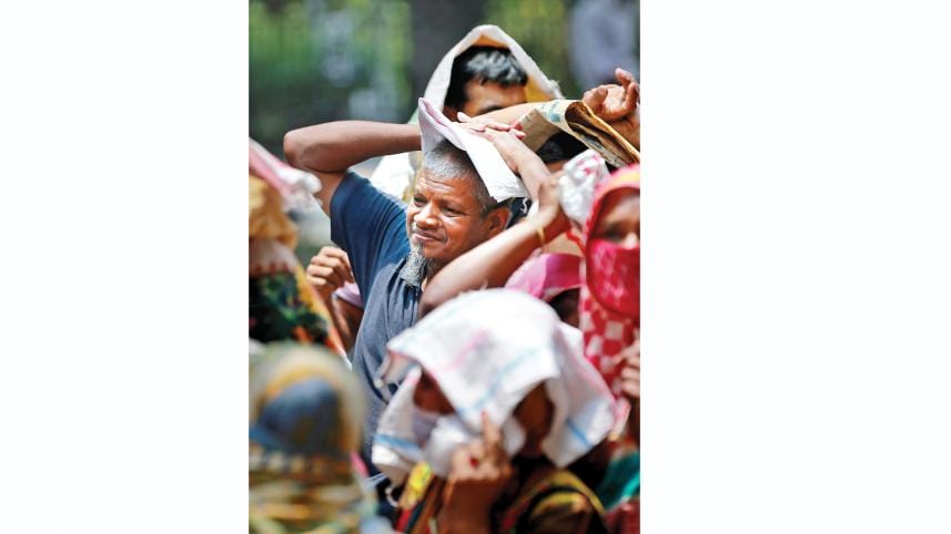 In the scorching summer heat, low-income individuals queued up on Abdul Gani Road in the capital yesterday to buy rice and flour from an OMS truck at subsidised prices.