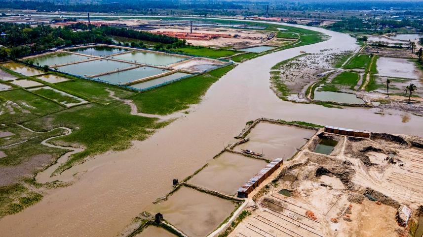 An illegal fish enclosure built by blocking the Sholmari river in Khulna continues to disrupt its natural flow. Meanwhile, rampant encroachment is also choking the river. As a result, monsoon waterlogging has worsened in nearby villages, damaging farmland, threatening biodiversity, and disrupting the region’s ecological balance. The photo was taken from the Sholmari Kheaghat area recently. Photo: Habibur Rahman