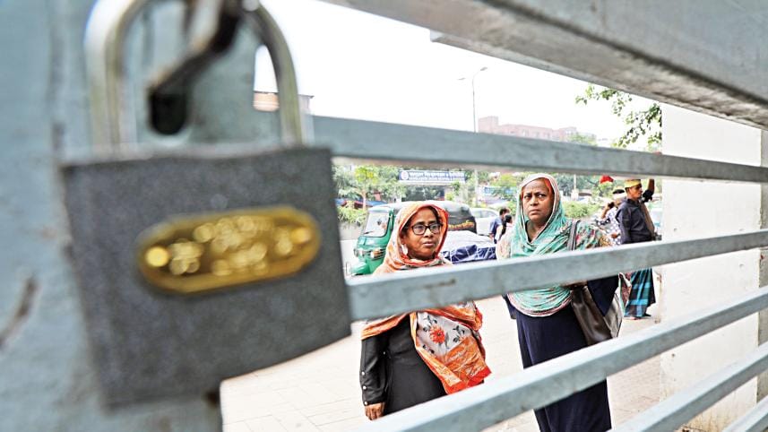 Two women stood outside the National Institute of Ophthalmology and Hospital in Dhaka yesterday, as services remained suspended for the seventh consecutive day. Doctors and nurses have halted work, citing security concerns after an alleged attack by injured July uprising victims -- currently receiving treatment at the hospital -- and a tripartite clash involving patients and their attendants last Wednesday. Photo: Prabir Das