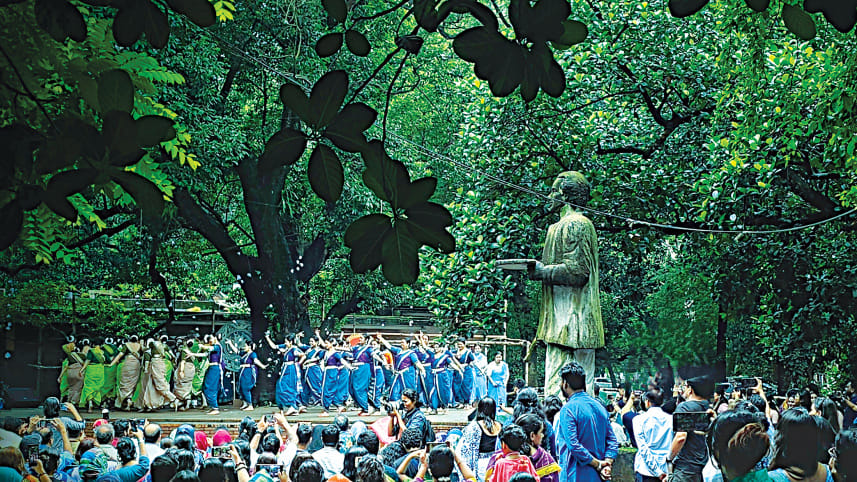 Adult beginner dancers from diverse professions -- including students, teachers, and corporate officials -- perform at Bokultola of the Faculty of Fine Arts, Dhaka University, yesterday. Titled “Ghonoghota”, the production was staged by Arthy Ahmed Dance Academy. The event was organised with an aim to create a safe space for adults to pursue their lifelong dream of learning Bharatanatyam and other dance forms. Photo: Courtesy/Bishwajit Goswami
