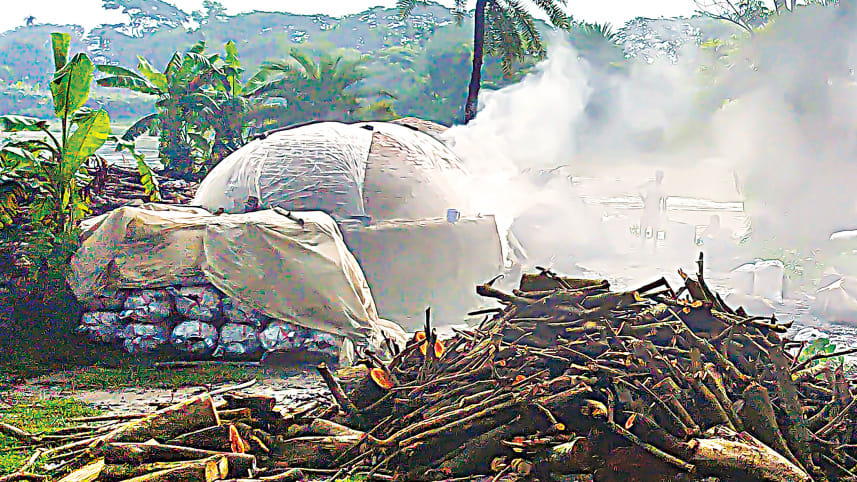 Coal is being illegally produced using specially designed clay furnaces to burn timber collected from nearby villages. The process not only strips the landscape of green trees but also fills the air with black smoke. The photo was taken in Siddhipasha of Jashore’s Abhaynagar upazila. Photo: Habibur Rahman