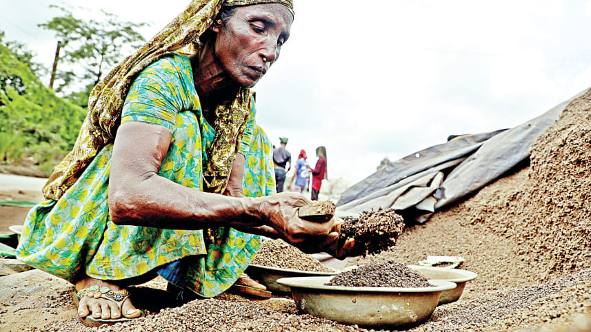THE FACE OF STRUGGLE … For two decades, Firoza Begum has sustained her family by separating iron from re-rolling mill scraps with a magnet. Widowed and now earning only Tk 300 a day, she bears all household expenses alone. Scorching sun, dust and heat from the metals have darkened her face to a copper hue. The photo was taken recently in Dhaka’s Shyampur area. PHOTO: PALASH KHAN