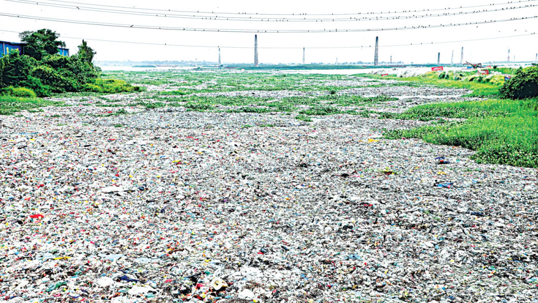 Reckless dumping of garbage, mostly plastic, has completely filled parts of a low-lying wetland along the Dhaka-Aricha highway at Baliarpur in Savar. In the distant background, several brick kilns, a major source of air pollution, line the horizon. The photo was taken on Friday.