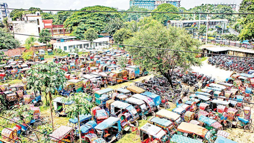 Numerous illegal battery-run auto-rickshaws lie in the impound zone in Darus Salam area on the capital’s Mirpur Road yesterday. The risky movement of such vehicles has disrupted life in the city. Although traffic police have seized many of these vehicles, they are often released after a few days, allowing the problem to persist.