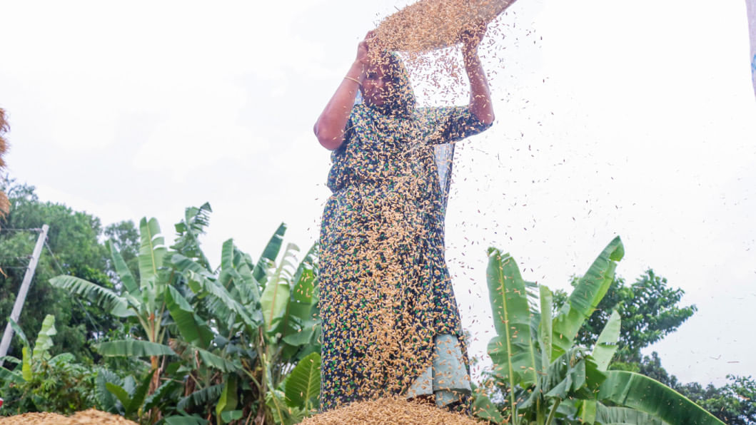 Rashida Begum winnows Aus paddy at Barakula village in Narail after farmers threshed the harvested crop yesterday. Aus is often used to produce various forms of rice and rice-based meals, and locals say this year’s yield has been fairly good, selling for Tk 1,000 to 1,100 per maund.