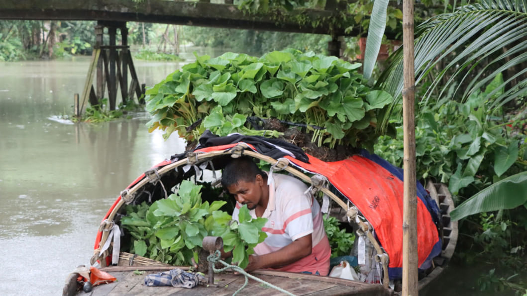 A trader loads winter vegetable saplings onto his boat. He will take them to various urban and rural markets to sell to local farmers so they can begin planting winter vegetables soon. The photo was taken in Barishal’s Babuganj upazila yesterday. Photo: Titu Das