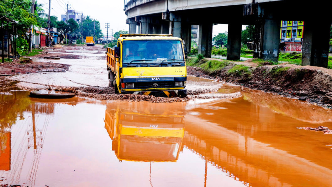 A truck plies along the pothole-riddled Shipyard Road in Khulna, which stretches from the Rupsha Traffic Intersection to Khan Jahan Ali Bridge. Once a busy commercial route, the road has now become a source of immense suffering for commuters, especially during the monsoon, as rainwater often leaves it waterlogged. The photo was taken yesterday. Photo: Habibur Rahman