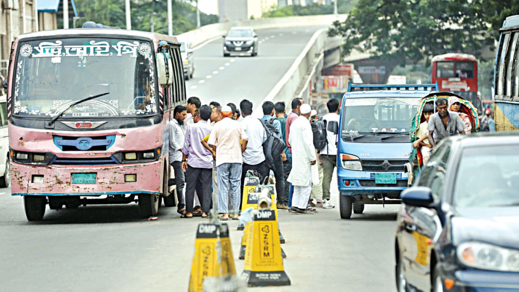 A bus stops just after exiting the elevated expressway at Farmgate to pick up and drop off passengers. The sudden halt raises the risk of accidents, with vehicles coming down the ramp at speed. The passengers getting off and on also cause jams on the street.