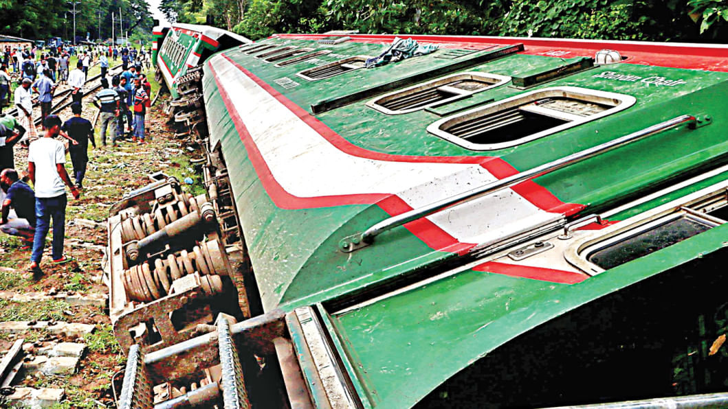 The locomotive and several coaches of the Udayan Express derailed in Sylhet’s Moglabazar area around 7:00am yesterday, leaving several passengers injured. Sylhet’s rail links with Dhaka and Chattogram were restored after the lines were cleared nearly three hours later. Photo: Sheikh Nasir