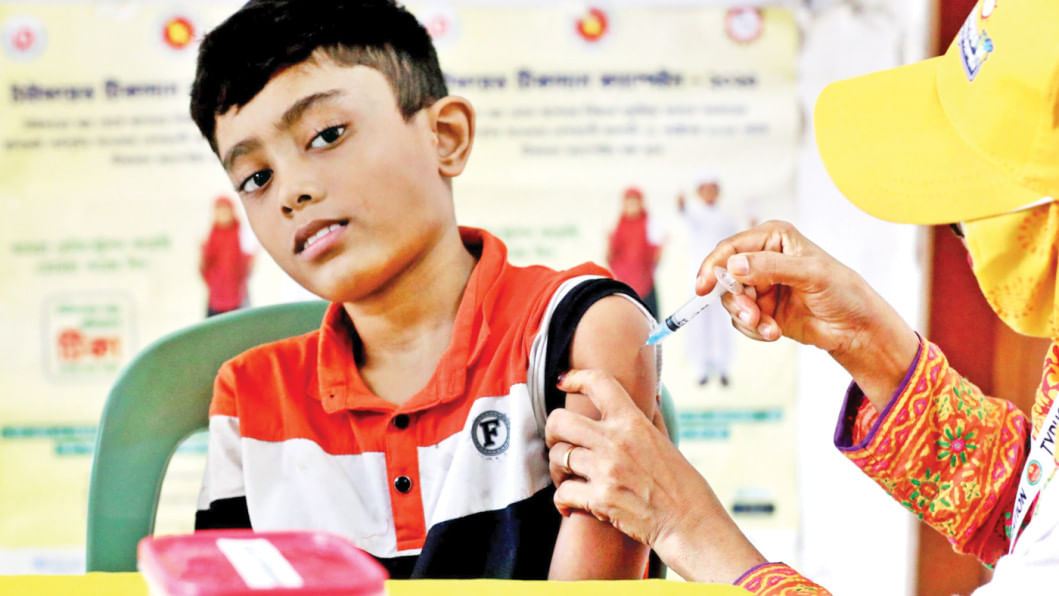 A child receives a Typhoid Conjugate Vaccine (TCV) shot at the Nagar Shastho Kendro on Salimullah Road in the capital’s Mohammadpur yesterday morning. Over 10 lakh children were vaccinated on the first day of a month-long nationwide campaign targeting 4.9 crore children aged between nine months and 15 years.