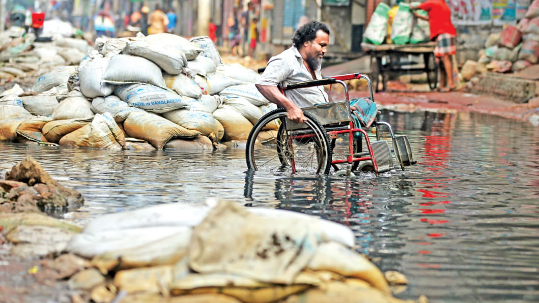 Four years in filth: A man in a wheelchair makes his way through ankle-deep, pitch black water on the Pipe Rasta of North Jurain in Dhaka yesterday. Residents say the area’s drainage system collapsed four years ago, but Dhaka South City Corporation has yet to act. They suffer all the time, especially during rain.