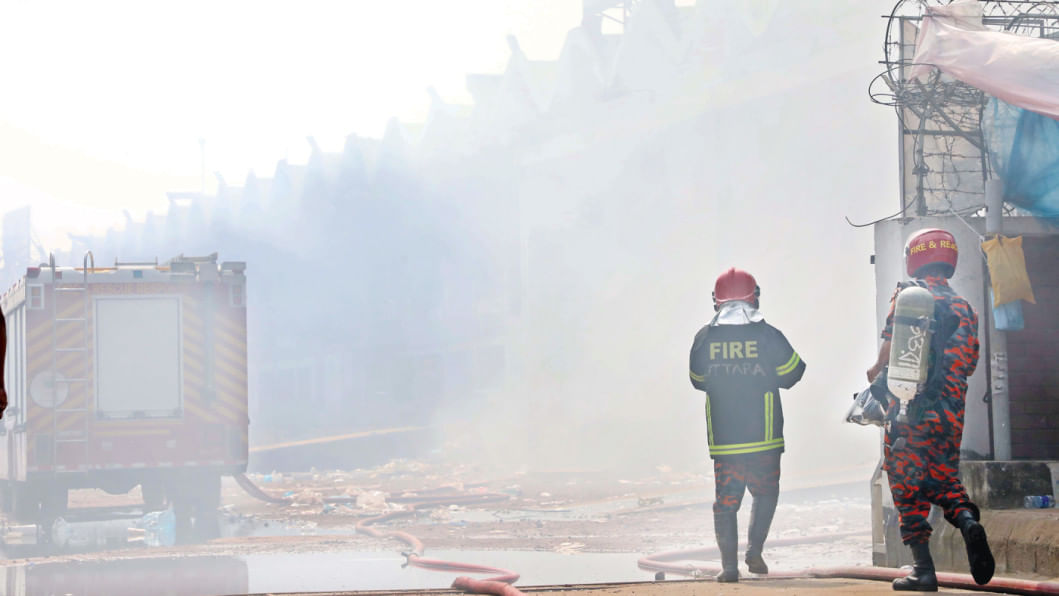 Firefighters continued working yesterday at the site of a blaze that destroyed the import section of Hazrat Shahjalal International Airport’s cargo village in the capital on Saturday.