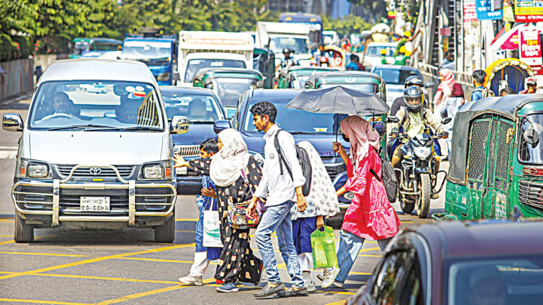A woman, her children, and others jaywalk across the busy Kazi Nazrul Islam Avenue in the capital’s Farmgate area between two nearby footbridges and two zebra crossings. The risky move, photographed yesterday, exposed them to the dangers of a fatal accident.