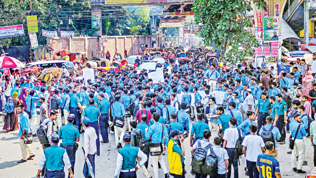 Students of Government Science College in Tejgaon stage a protest at Farmgate in the capital yesterday, demanding the removal of illegal shops and rickshaw stands occupying the road and footpath near their institution to ensure safe and congestion-free movement for both students and commuters.
