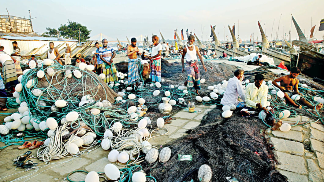 Fishermen prepare their nets and boats at Fishery Ghat in the port city yesterday, ready to sail into the Bay of Bengal as the 22-day fishing ban ends at midnight.