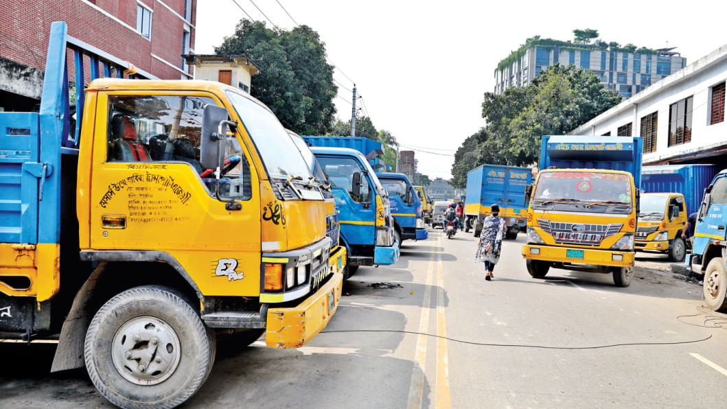 Rows of trucks have been parked illegally along this entire stretch of road near the Samakal and Channel 24 offices in Tejgaon, leaving barely any space for traffic. Pedestrian movement is also risky, as pavements have been encroached upon by local businesses. Such irregularities are common on roads across the Tejgaon Industrial Area. The photo was taken yesterday.