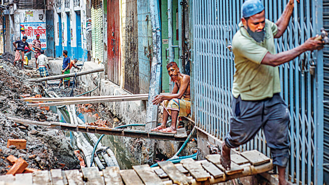 Workers navigate perilously narrow bamboo bridges along the Water Works Road in the capital’s Rahmatganj area yesterday, as Dhaka South City Corporation’s prolonged drainage work drags on, disrupting lives and endangering safety.