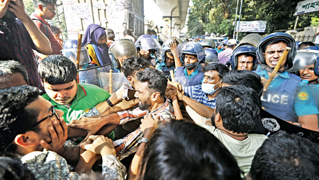 Police intercept and detain a group of graduates with disabilities at Shahbagh yesterday as they march towards the chief adviser’s residence, Jamuna, to press home a five-point demand, including employment opportunities. The protesters, under the banner of ‘Chakri Pratyashi Protibondhi Graduate Parishad’, have been demonstrating for inclusive and sustainable development for all job-seeking graduates with disabilities. Photo: Star