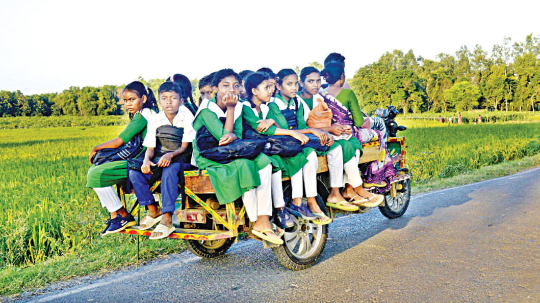 A battery-powered van crammed with schoolchildren makes its way down a rural road. Too far to walk and too remote for formal transport options, students, parents and teachers rely on these unregistered vehicles for both the morning commute and the journey home. The photo was taken in the Kakonhat area of Godagari upazila in Rajshahi recently. Photo: Azahar Uddin