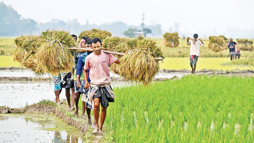 Farmers walk in a line across a muddy rice field, each balancing bundles of freshly harvested Aush paddy on their shoulders in Mahadevpur upazila of Naogaon yesterday. This season, Naogaon farmers cultivated the Aush paddy on 58,696 hectares -- more than any other district in the north. According to the local agricultural department, Naogaon is expected to see a yield of nearly 265,000 tonnes of Aush paddy this season. Photo: Mostafa Shabuj