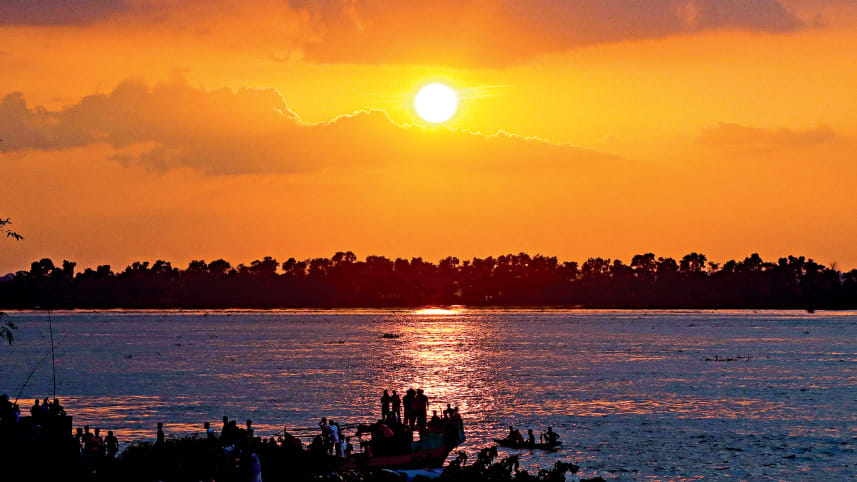 As the evening sun sets, glowing like an orange ball in the distance, people from all walks of life gather at nearby ghats to witness the majestic spectacle. The photo was taken from Baruipara Ferry Ghat in Kalia upazila of Narail yesterday. Photo: Habibur Rahman