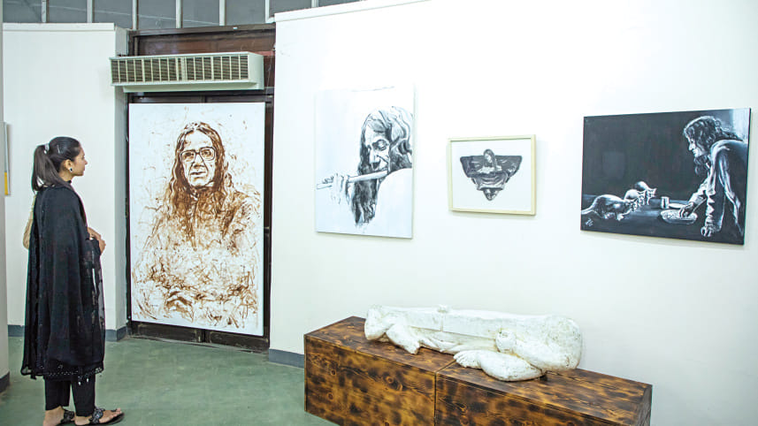 On the 101st birth anniversary of SM Sultan yesterday, Dhaka University’s Faculty of Fine Arts came alive with a vibrant festival celebrating his legacy. Although Sultan’s own paintings were absent, contemporary artists showcased works inspired by his powerful, realistic style. Organised by the Charupith Art Research Institute and its partners, the event included exhibitions, seminars, and film screenings, reaffirming Sultan’s lasting impact on Bangladeshi art and culture. Photo: Sheikh Mehedi Morshed
