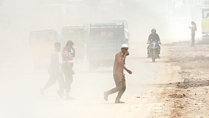 People shield their faces as they walk through dust-laden winds in the Shyampur area of the capital. Due to ongoing construction and road works, the air is thick with dust and pollutants. There are also factories in the area that contribute to the worsening air quality. The photo was taken yesterday. Photo: Palash Khan