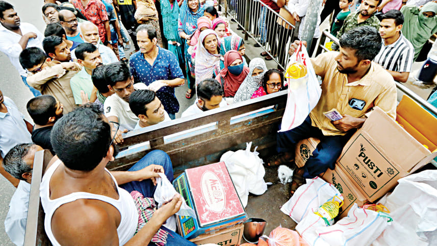 After a two-month hiatus, TCB trucks resumed nationwide operations yesterday, selling essential items like oil, sugar, and lentils at subsidised rates. The photo was taken in Dhaka’s Khamarbari area. Photo: Prabir Das