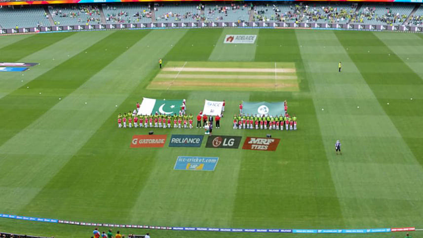 Pakistan and Ireland players assemble for the national anthem ahead of the World Cup game between the two at Adelaide Oval on March 15, 2015. Photo: ICC