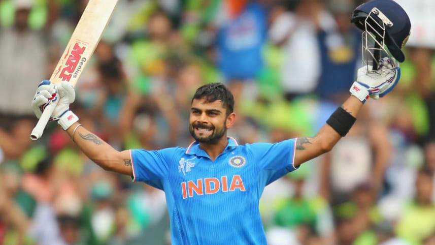 India's Virat Kohli drives a ball during the high-voltage match against Pakistan at Adelaide in the fourth match of the World Cup 2015. Photo: ICC