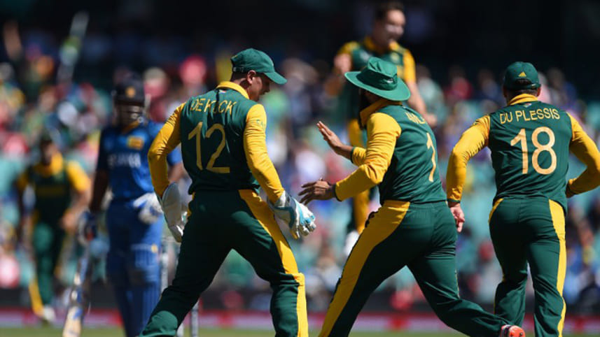 South African cricketers Hashim Amla (C) and Faf du Plessis (R) reacts as wicketkeeper Quinton de Kock (front L) takes a catch to dismiss Sri Lankan cricketer Kusal Perera (back L-in blue) at the Sydney Cricket Ground during the 2015 Cricket World Cup quarter-final match between Sri Lanka and South Africa in Sydney on March 18, 2015. Photo: AFP
