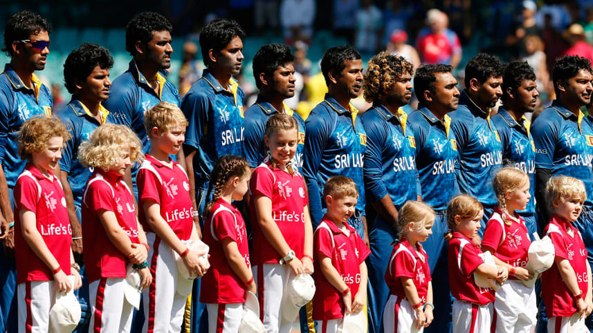 Members of the team from Sri Lanka stand together during the playing of the national anthems before the start of their Cricket World Cup quarter-final match against South Africa at the Sydney Cricket Ground (SCG) March 18, 2015. Photo: Reuters